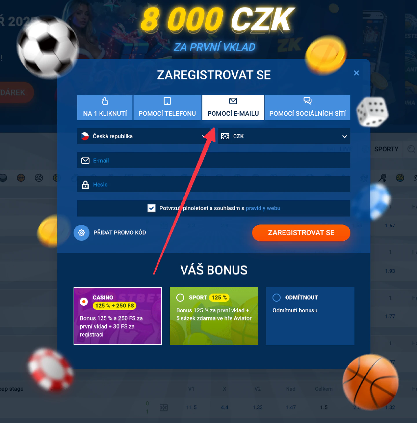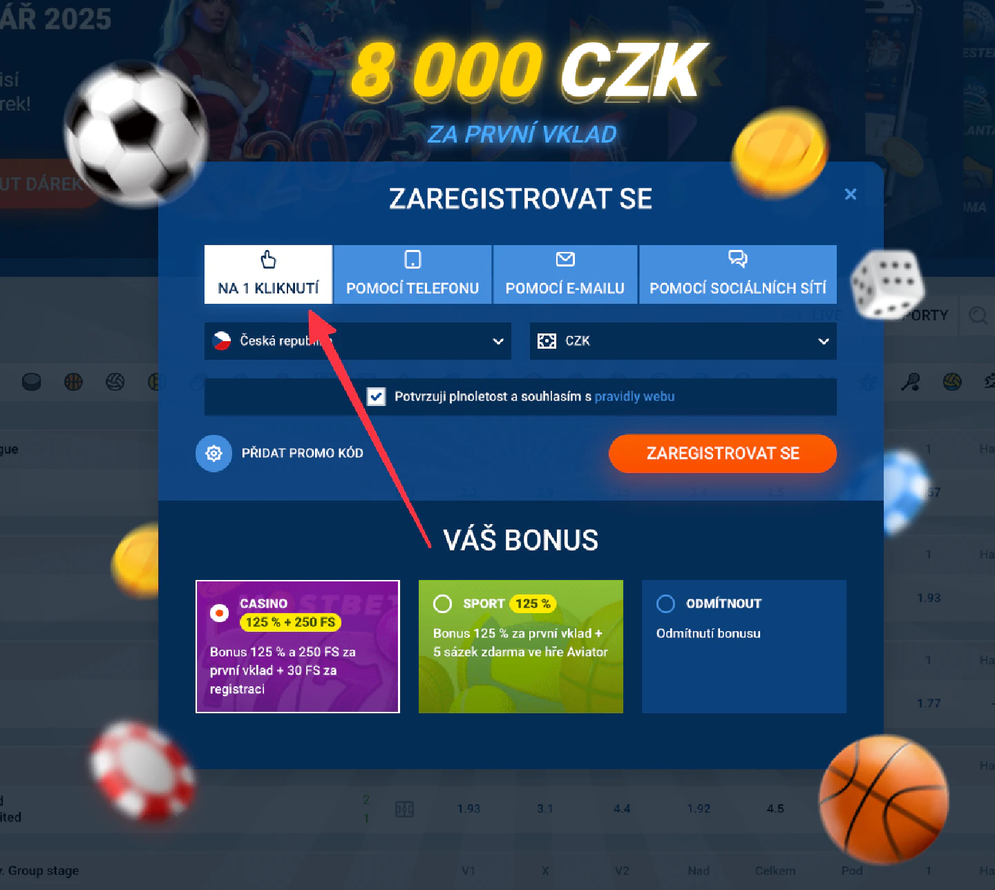 - Možnost zadání aktivního promo kódu pro uvítací a pravidelné bonusy.